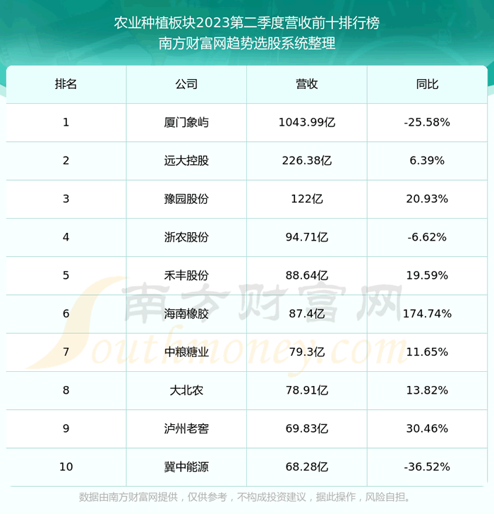 按照趋势选股系统统计,该股所属板块为农业种植板块,该板块共有86只股票,亚盛集团2023第二季度营收在该板块中排名为第42名,该板块2023第二季度营收排名前十的股票如下表: