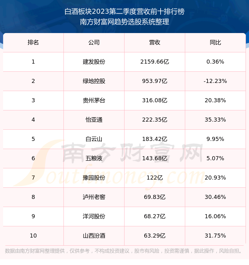 按照趋势选股系统统计,该股所属板块为白酒板块,该板块共有61只股票,金种子酒2023第二季度营收在该板块中排名为第43名,该板块2023第二季度营收排名前十的股票如下表: