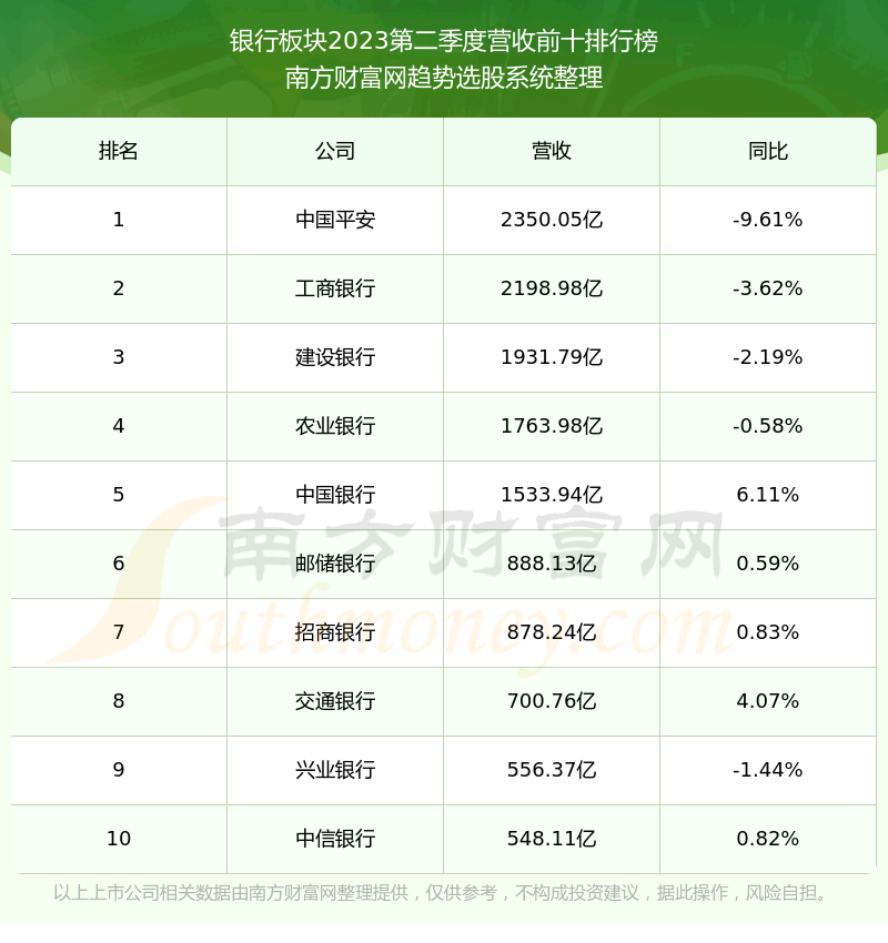 按照趋势选股系统统计,该股所属板块为银行板块,该板块共有44只股票,厦门银行2023第二季度营收在该板块中排名为第38名,该板块2023第二季度营收排名前十的股票如下表: