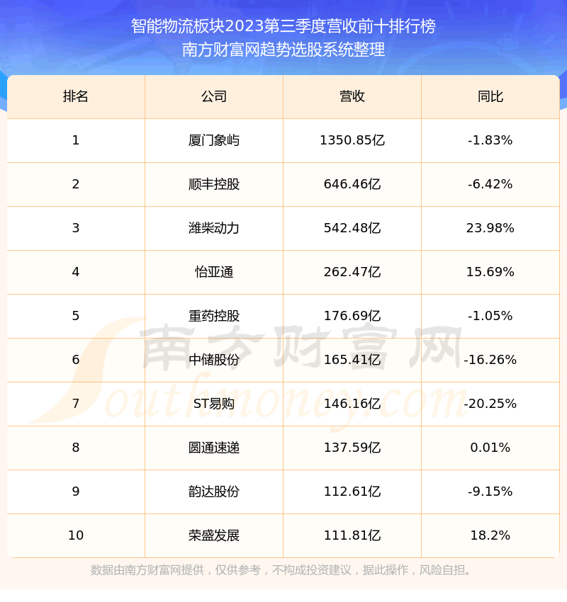 按照趋势选股系统统计,该股所属板块为智能物流板块,该板块共有82只股票,瑞晟智能2023第三季度营收在该板块中排名为第81名,该板块2023第三季度营收排名前十的股票如下表: