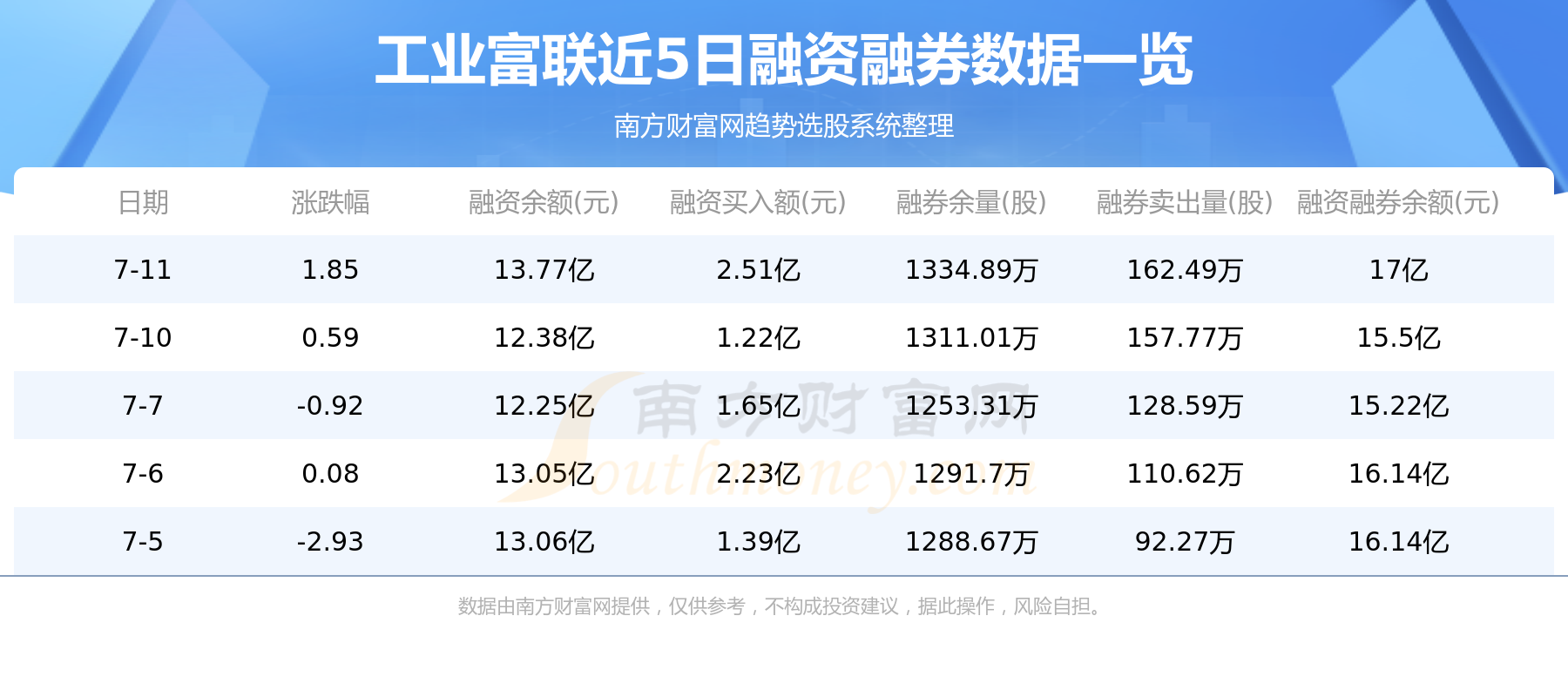 7月11日工业富联融券信息显示,融资方面,当日融资买入2.51亿元,融资偿还1.12亿元,融资净买额1.39亿元。融券方面,融券卖出162.49万股,融券偿还138.61万股,融券余量1334.89万股,融券余额3.24亿元。融资融券余额17亿元。近5日融资融券数据一览见下表: