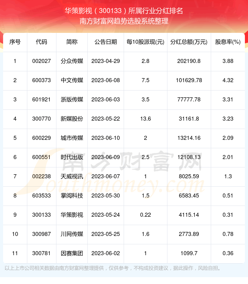 按照趋势选股系统统计,华策影视所属行业为文化传媒行业,文化传媒行业分红排名情况如下表: