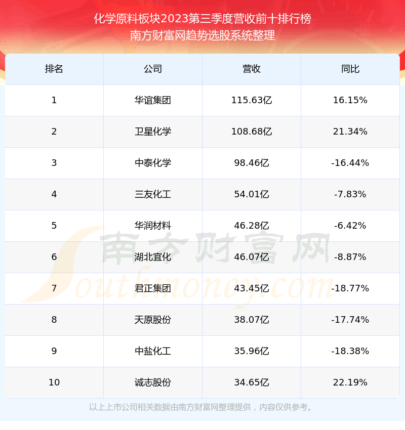 按照趋势选股系统统计,该股所属板块为化学原料板块,该板块共有67只股票,振华股份2023第三季度营收在该板块中排名为第27名,该板块2023第三季度营收排名前十的股票如下表: