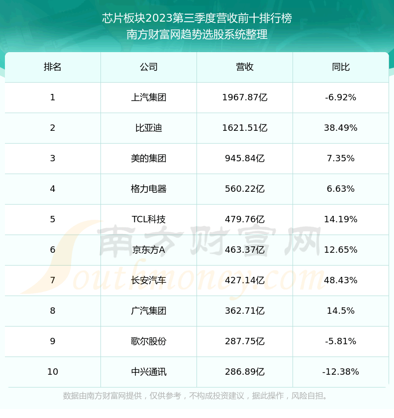 按照趋势选股系统统计,该股所属板块为芯片板块,该板块共有545只股票,中科蓝讯2023第三季度营收在该板块中排名为第315名,该板块2023第三季度营收排名前十的股票如下表: