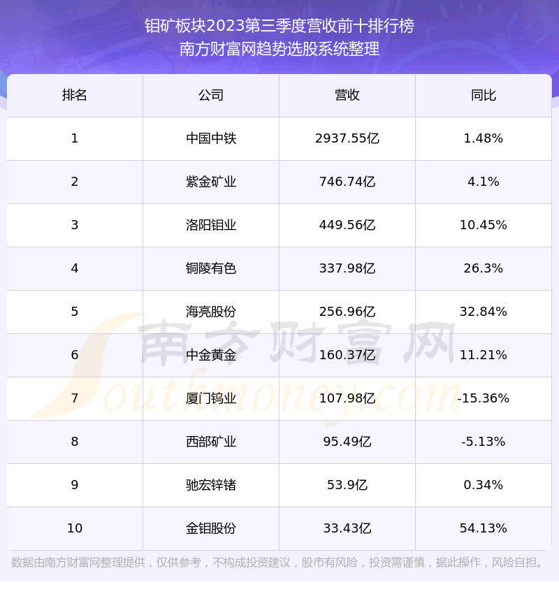 按照趋势选股系统统计,该股所属板块为钼矿板块,该板块共有16只股票,金钼股份2023第三季度营收在该板块中排名为第10名,该板块2023第三季度营收排名前十的股票如下表: