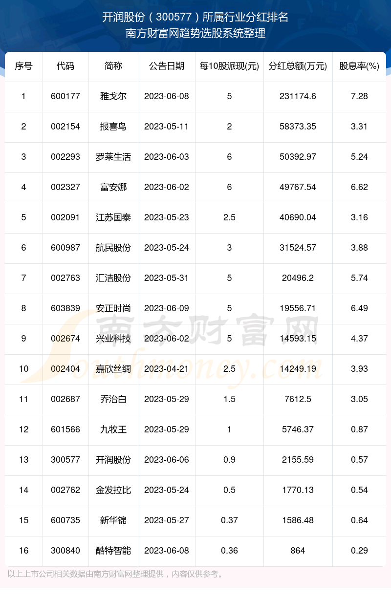 二、开润股份300577行业分红排名