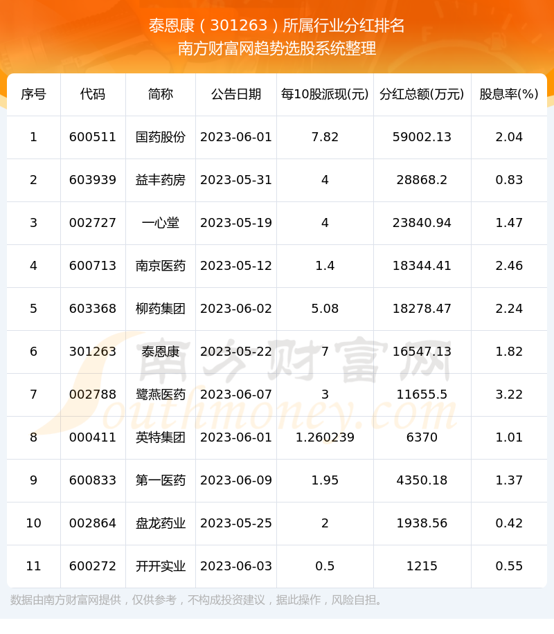按照趋势选股系统统计,泰恩康所属行业为医药商业行业,医药商业行业分红排名情况如下表: