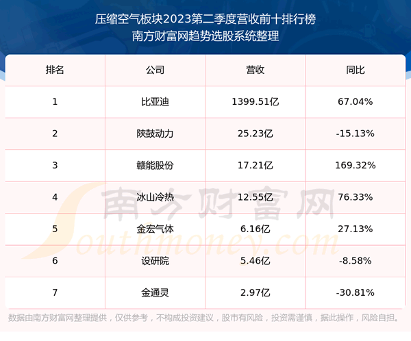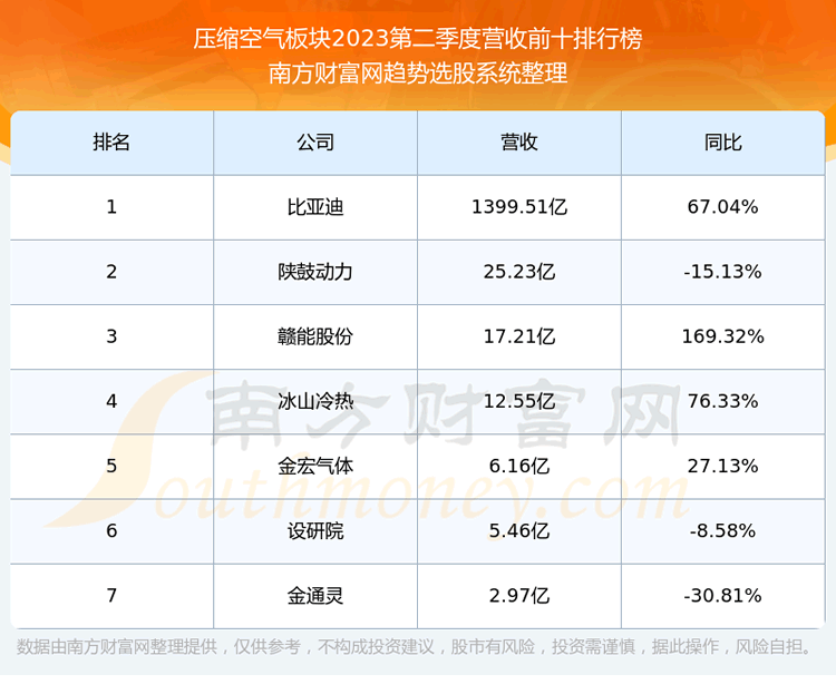 按照趋势选股系统统计,该股所属板块为压缩空气板块,该板块共有7只股票,物产环能2023第二季度营收在该板块中排名为第7名,该板块2023第二季度营收排名前十的股票如下表: