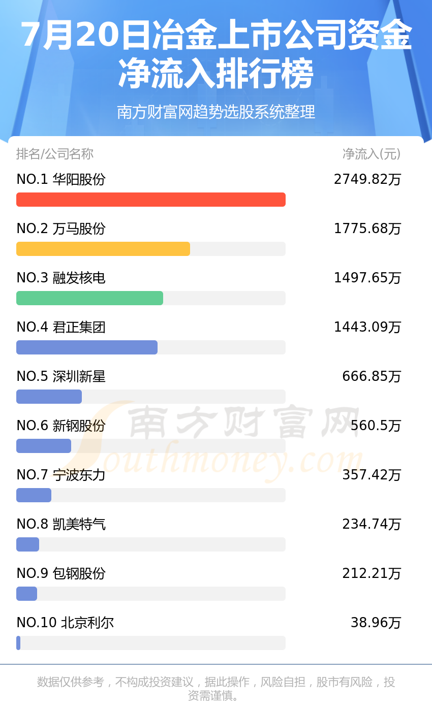 冶金上市公司7月20日资金净流入情况来看,华阳股份位列第一位,主力净流入达到2749.82万元;万马股份排名第二,主力净流入为1775.68万元;融发核电排名第三,主力净流入1497.65万元。主力净流入排名前10的还有:君正集团、深圳新星、新钢股份、宁波东力、凯美特气、包钢股份、北京利尔。