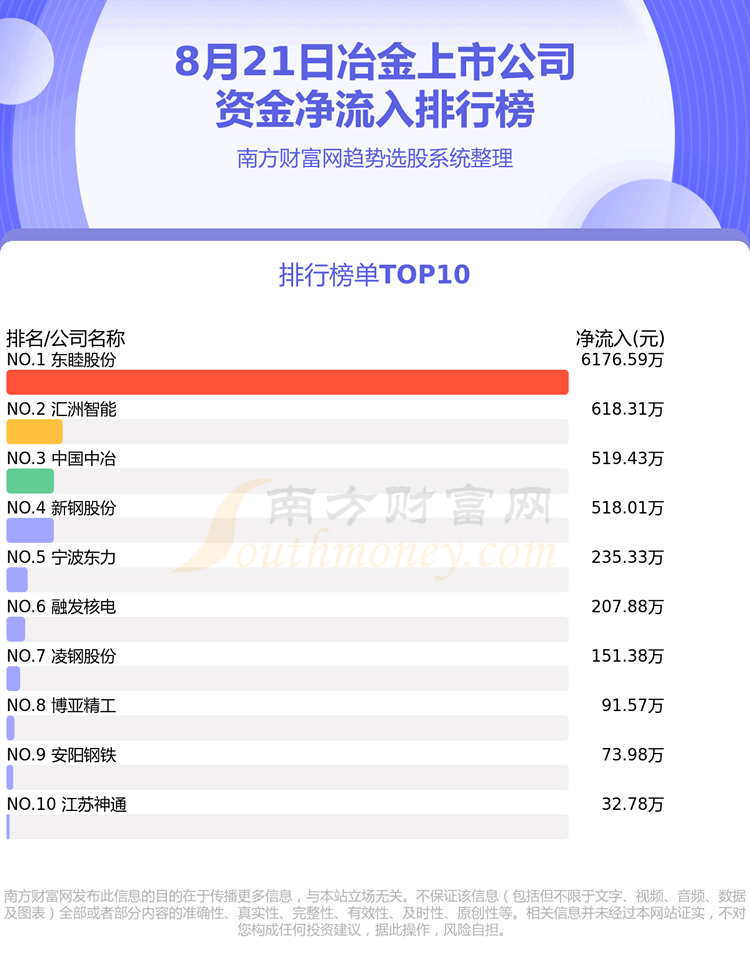 冶金上市公司8月21日资金净流入情况来看,东睦股份位列第一位,主力净流入达到6176.59万元;汇洲智能排名第二,主力净流入为618.31万元;中国中冶排名第三,主力净流入519.43万元。主力净流入排名前10的还有:新钢股份、宁波东力、融发核电、凌钢股份、博亚精工、安阳钢铁、江苏神通。