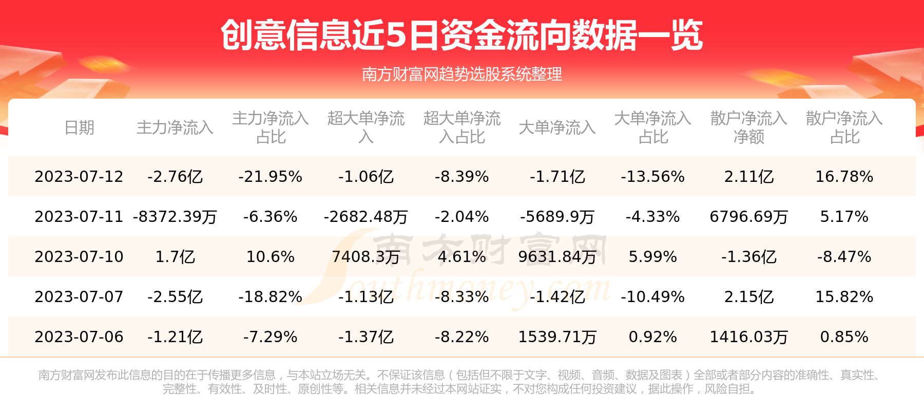 7月12日消息,创意信息7月12日主力净流出2.76亿元,超大单净流出1.06亿元,大单净流出1.71亿元,散户净流入2.11亿元。