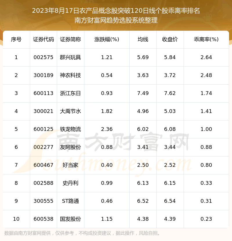 2023年8月17日农产品概念股突破120日线个股乖离率排名