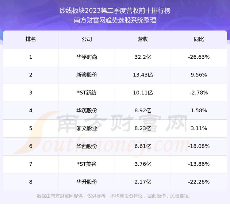 按照趋势选股系统统计,该股所属板块为纱线板块,该板块共有2只股票,浙文影业2023第二季度营收在该板块中排名为第2名,该板块2023第二季度营收排名前十的股票如下表: