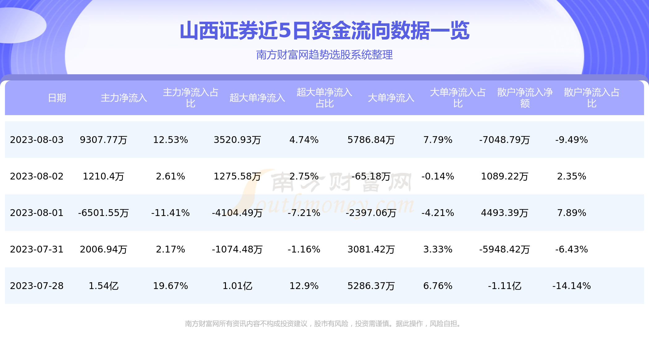 8月3日消息,山西证券8月3日主力净流入9307.77万元,超大单净流入3520.93万元,大单净流入5786.84万元,散户净流出7048.79万元。