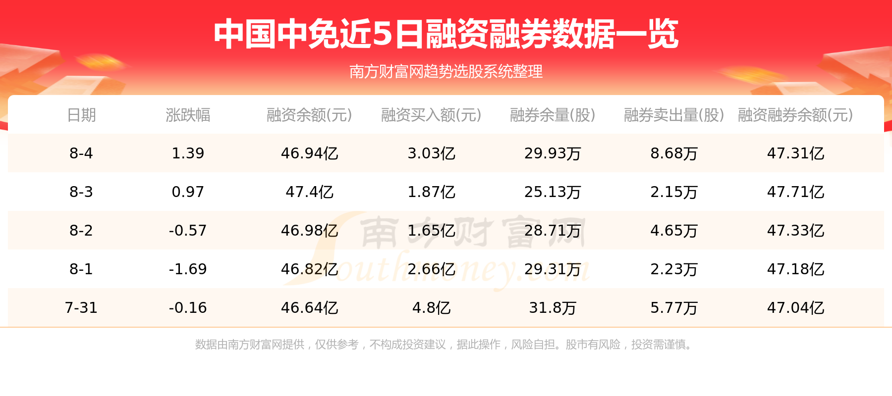 中国中免8月4日融券信息显示,融资方面,当日融资买入3.03亿元,融资偿还3.49亿元,融资净买额-4616.95万元。融券方面,融券卖出8.68万股,融券偿还3.88万股,融券余量29.93万股,融券余额3767.1万元。融资融券余额47.31亿元。近5日融资融券数据一览见下表: