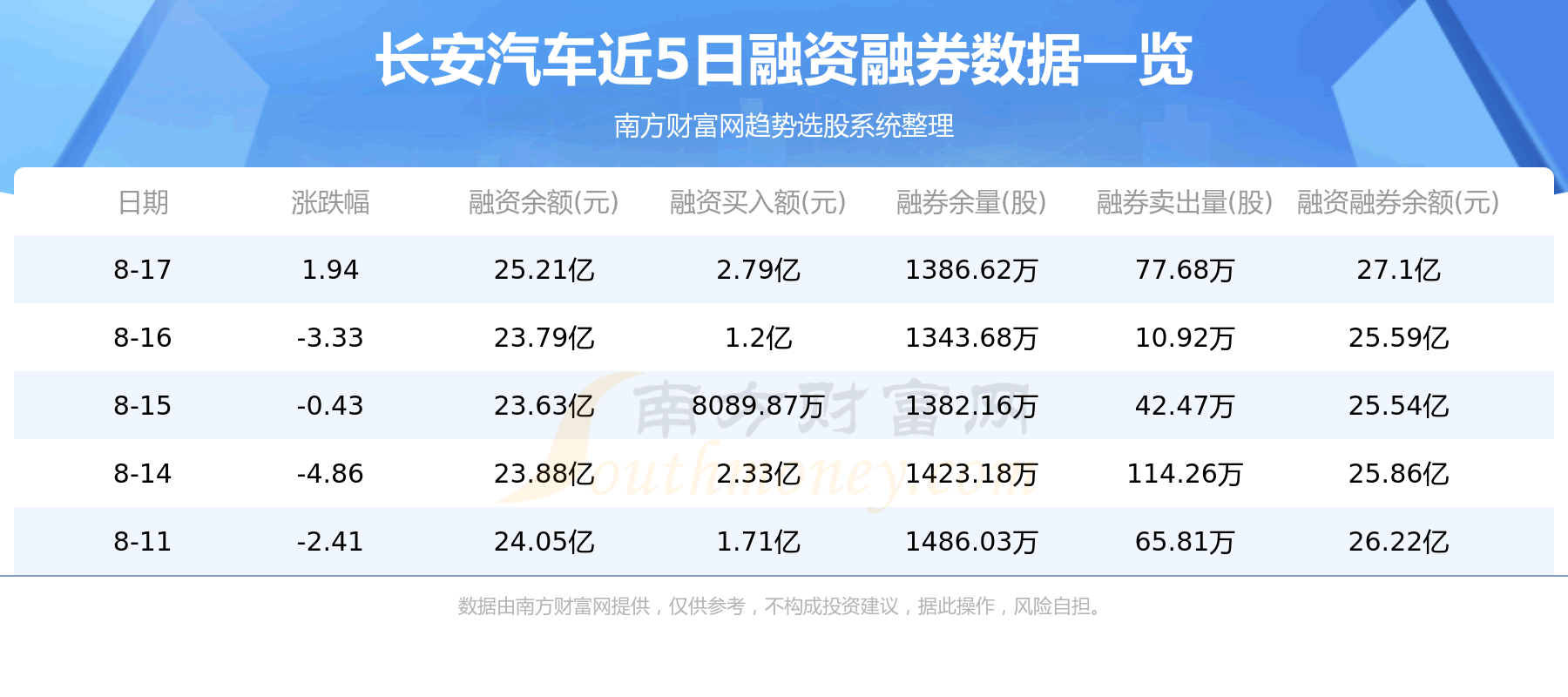 8月17日长安汽车融券信息显示,融资方面,当日融资买入2.79亿元,融资偿还1.38亿元,融资净买额1.41亿元。融券方面,融券卖出77.68万股,融券偿还34.74万股,融券余量1386.62万股,融券余额1.89亿元。融资融券余额27.1亿元。近5日融资融券数据一览见下表: