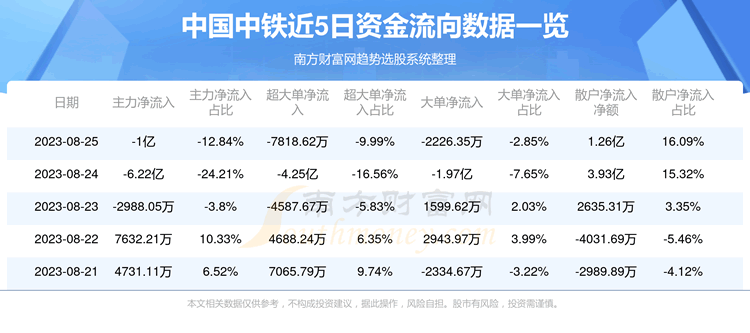 8月25日消息,中国中铁8月25日主力资金净流出1亿元,超大单资金净流出7818.62万元,大单资金净流出2226.35万元,散户资金净流入1.26亿元。