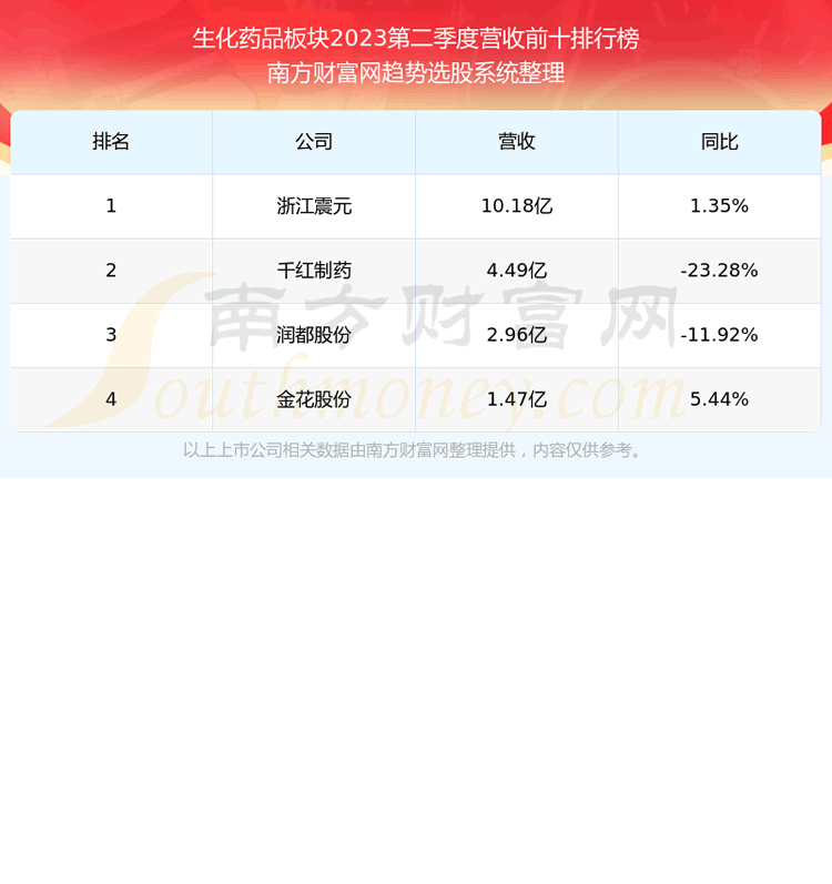 按照趋势选股系统统计,该股所属板块为生化药品板块,该板块共有4只股票,百利天恒2023第二季度营收在该板块中排名为第4名,该板块2023第二季度营收排名前十的股票如下表: