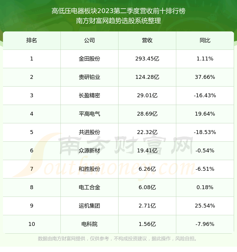 按照趋势选股系统统计,该股所属板块为高低压电器板块,该板块共有11只股票,百利电气2023第二季度营收在该板块中排名为第11名,该板块2023第二季度营收排名前十的股票如下表: