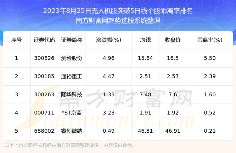 2023年8月25日无人机股突破5日线个股乖离率排名