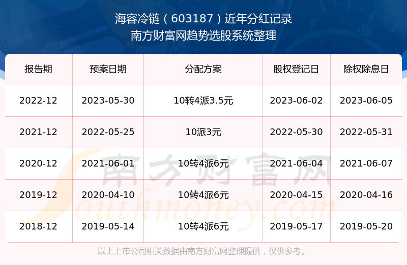 海容冷链最新一次公布的分红方案为10转4派3.5元。本次权益分派股权登记日为2023年6月2日,除权除息日为2023年6月5日,派息日为2023年6月5日。