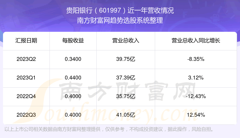 2023年第一季度季报显示,贵阳银行实现营收37.39亿元,同比增长3.12%;净利润为15.83亿元。