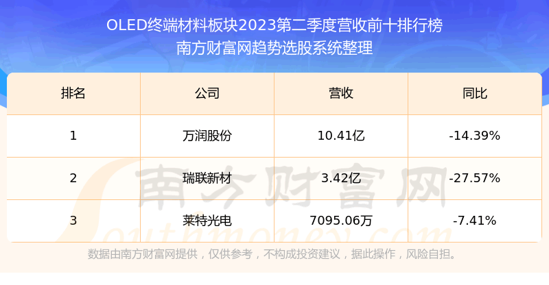 按照趋势选股系统统计,该股所属板块为OLED终端材料板块,该板块共有3只股票,莱特光电2023第二季度营收在该板块中排名为第3名,该板块2023第二季度营收排名前十的股票如下表: