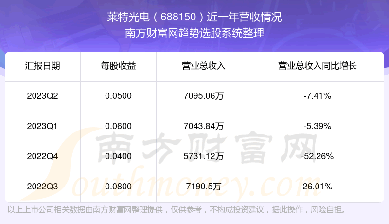 莱特光电2023年第二季度显示,公司主营收入7095.06万元,同比-7.41%;归母净利润2022.31万元,同比-18.27%;扣非净利润1357.08万元,同比-33.7%;