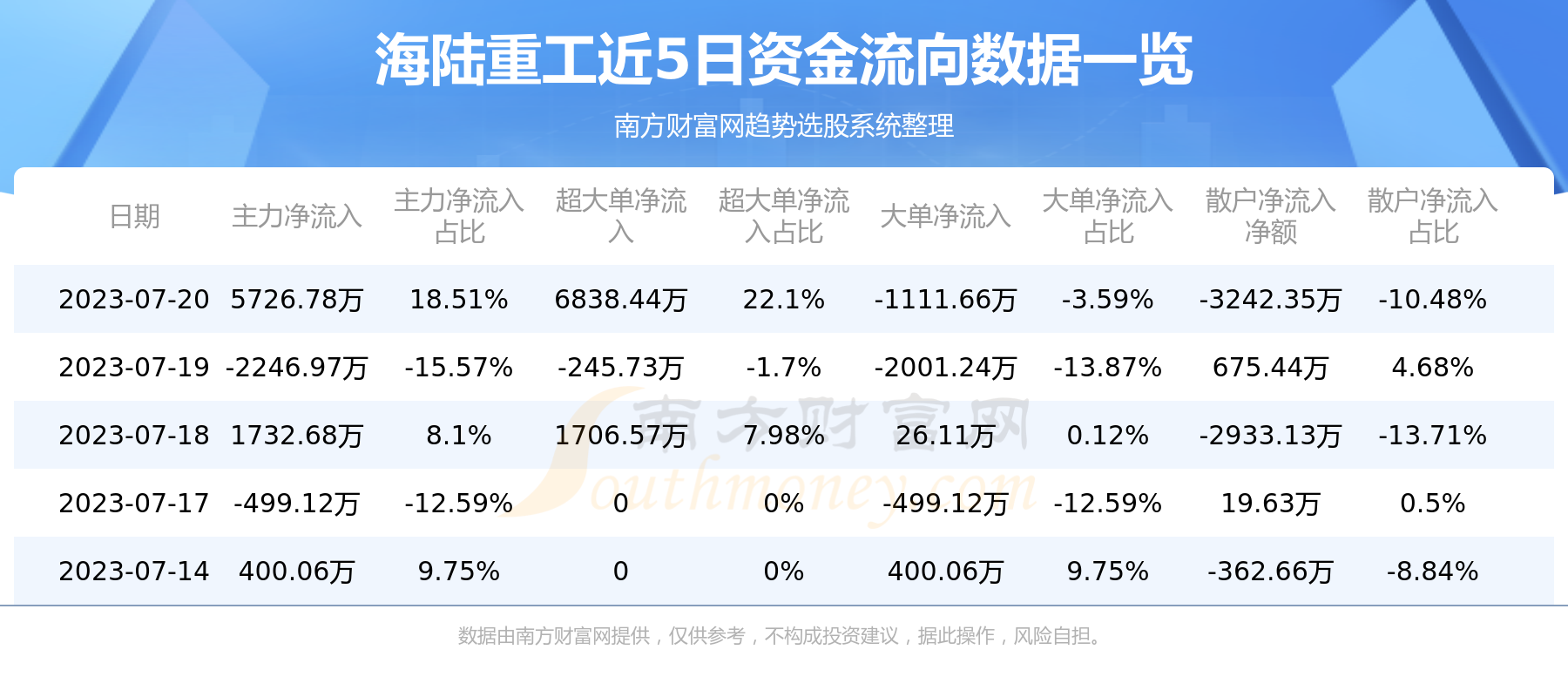 7月20日消息,海陆重工主力净流入5726.78万元,超大单净流入6838.44万元,散户净流出3242.35万元。