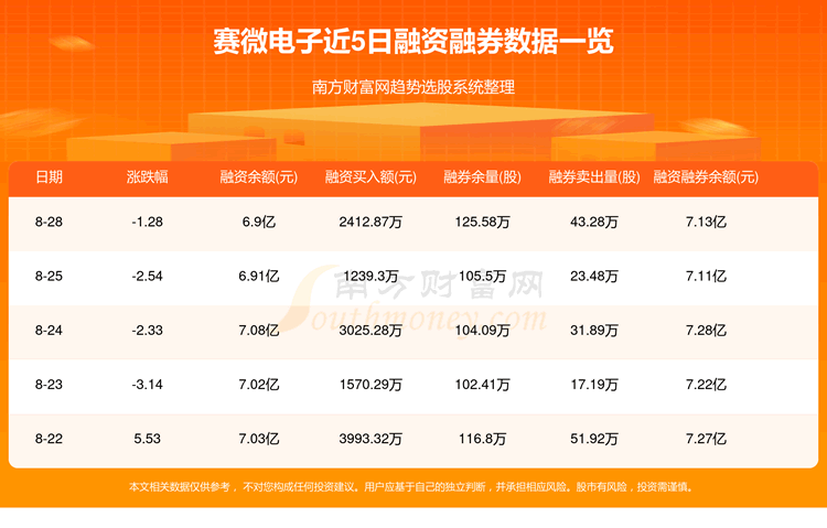 8月28日赛微电子融券信息显示,融资方面,当日融资买入2412.87万元,融资偿还2462.76万元,融资净买额-49.89万元。融券方面,融券卖出43.28万股,融券偿还23.2万股,融券余量125.58万股,融券余额2333.25万元。融资融券余额7.13亿元。近5日融资融券数据一览见下表:
