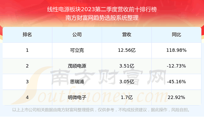 按照趋势选股系统统计,该股所属板块为线性电源板块,该板块共有4只股票,明微电子2023第二季度营收在该板块中排名为第4名,该板块2023第二季度营收排名前十的股票如下表: