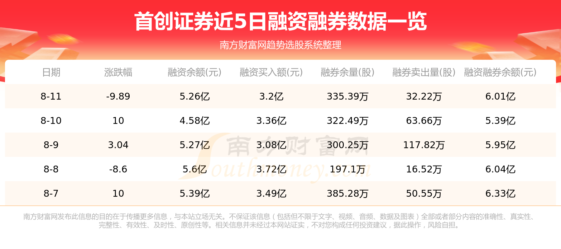 8月11日首创证券融券信息显示,融资方面,当日融资买入3.2亿元,融资偿还2.53亿元,融资净买额6724.31万元。融券方面,融券卖出32.22万股,融券偿还19.32万股,融券余量335.39万股,融券余额7546.37万元。融资融券余额6.01亿元。近5日融资融券数据一览见下表: