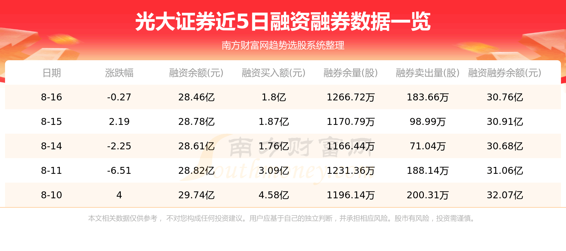 8月11日光大证券融券信息显示,融资方面,当日融资买入3.09亿元,融资偿还4.01亿元,融资净买额-9193.96万元。融券方面,融券卖出188.14万股,融券偿还152.92万股,融券余量1231.36万股,融券余额2.24亿元。融资融券余额31.06亿元。近5日融资融券数据一览见下表: