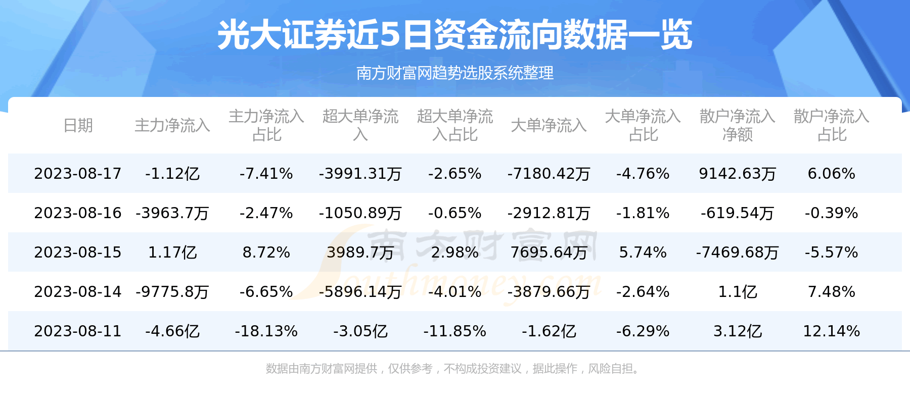 8月17日消息,光大证券8月17日主力净流出1.12亿元,超大单净流出3991.31万元,大单净流出7180.42万元,散户净流入9142.63万元。