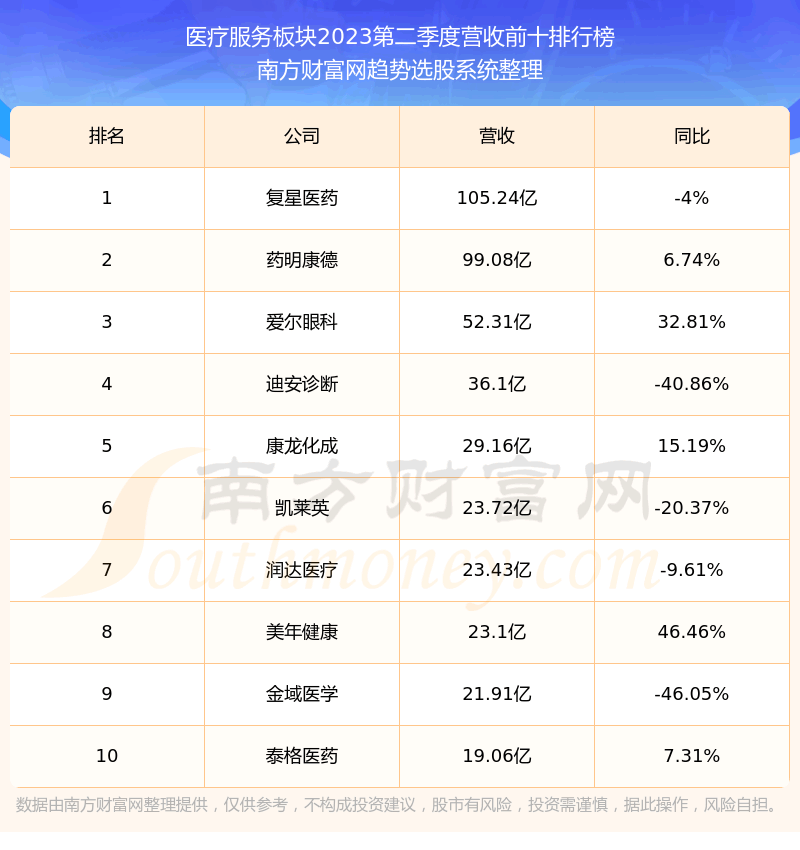 按照趋势选股系统统计,该股所属板块为医疗服务板块,该板块共有67只股票,药明康德2023第二季度营收在该板块中排名为第2名,该板块2023第二季度营收排名前十的股票如下表: