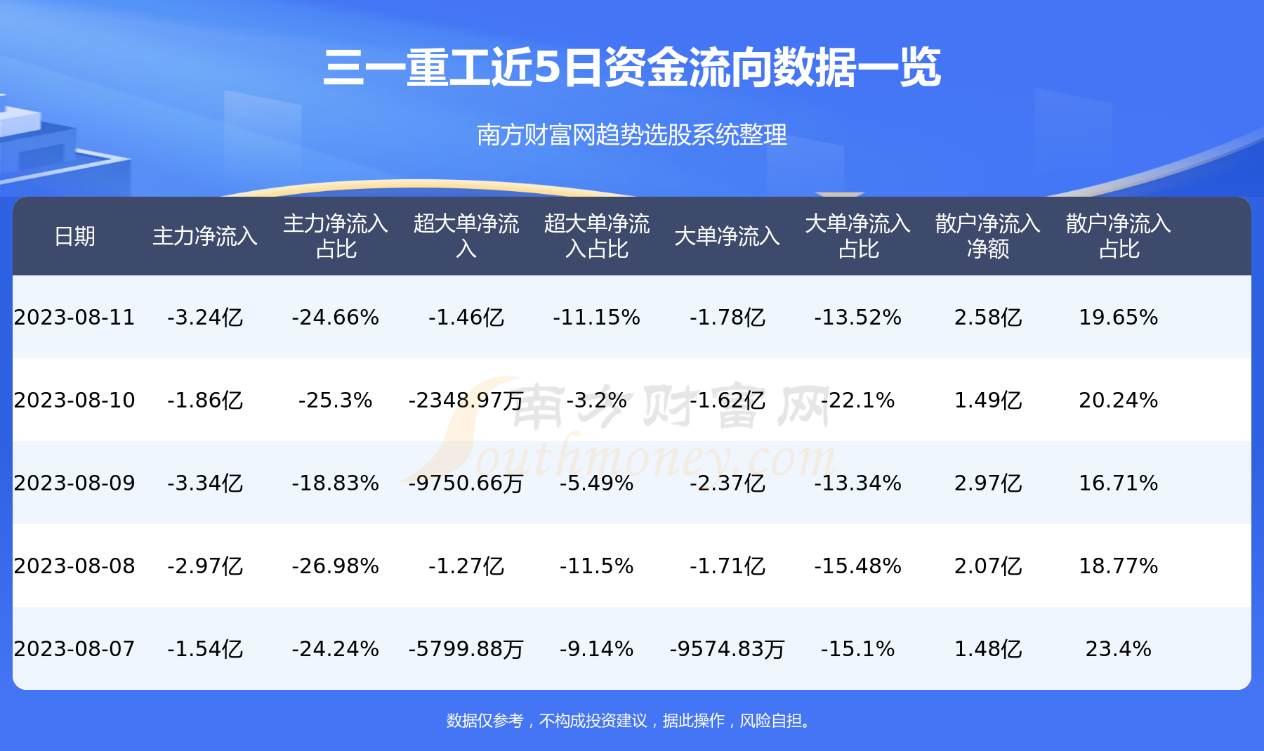 8月11日消息,三一重工主力资金净流出3.24亿元,超大单资金净流出1.46亿元,散户资金净流入2.58亿元。