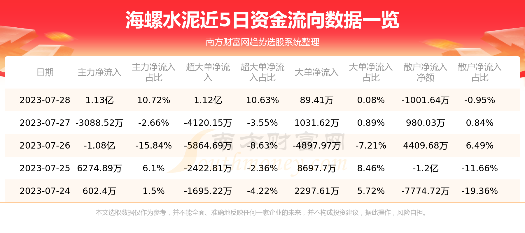 7月28日消息,海螺水泥7月28日主力净流入1.13亿元,超大单净流入1.12亿元,大单净流入89.41万元,散户净流出1001.64万元。