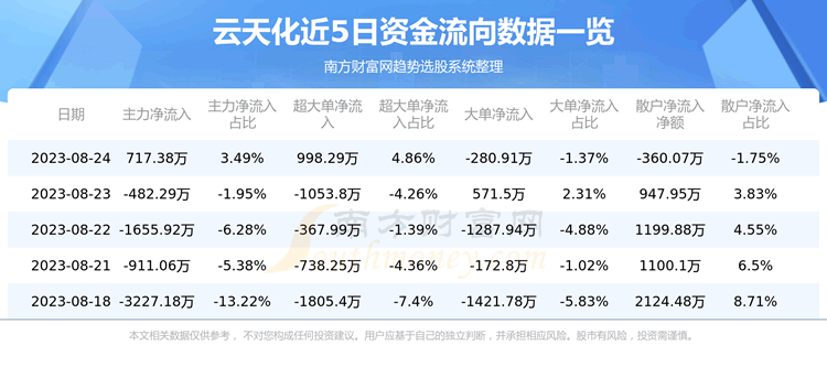 8月7日消息,云天化资金净流出3190.75万元,超大单净流出493.45万元,换手率1.14%,成交金额3.52亿元。
