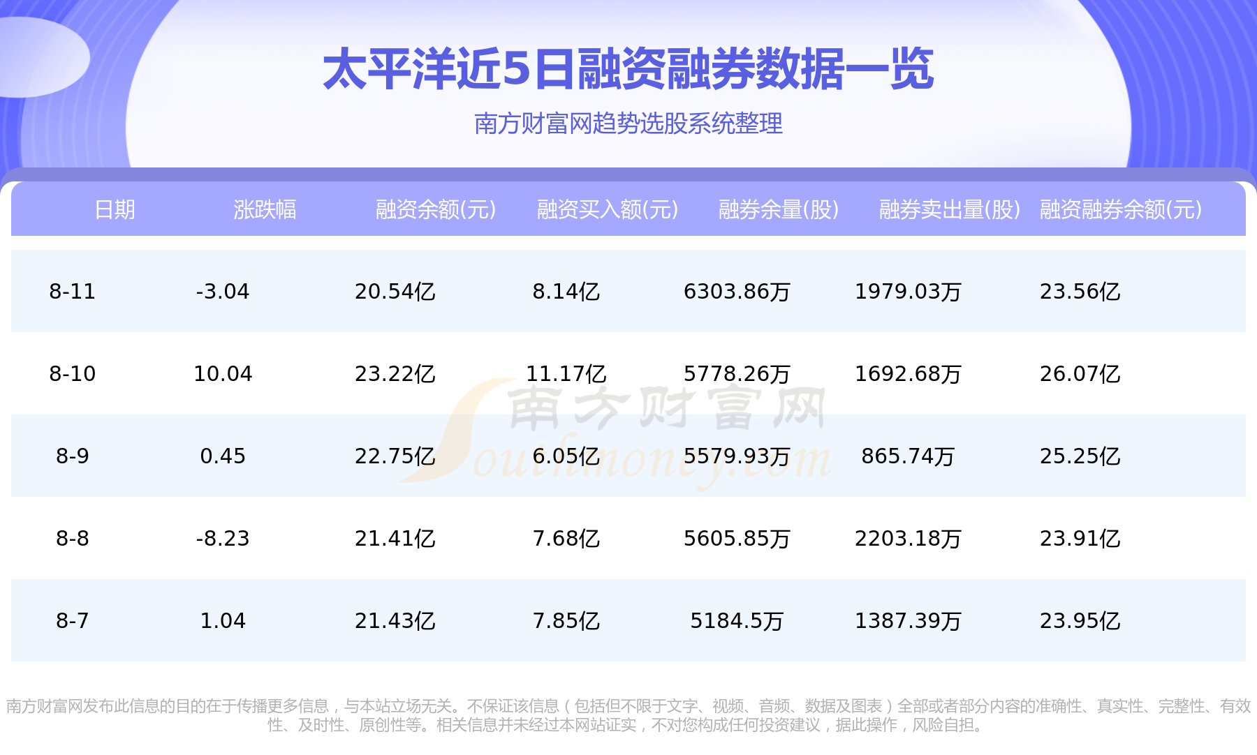 太平洋8月7日融券信息显示,融资方面,当日融资买入7.85亿元,融资偿还7.15亿元,融资净买额6960.23万元。融券方面,融券卖出1387.39万股,融券偿还2905.54万股,融券余量5184.5万股,融券余额2.52亿元。融资融券余额23.95亿元。近5日融资融券数据一览见下表: