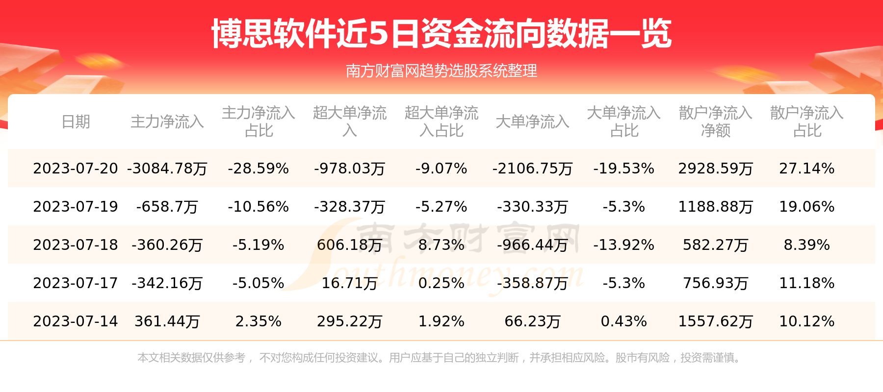 7月20日消息,博思软件资金净流出3084.78万元,超大单资金净流出978.03万元,换手率1.1%,成交金额1.08亿元。