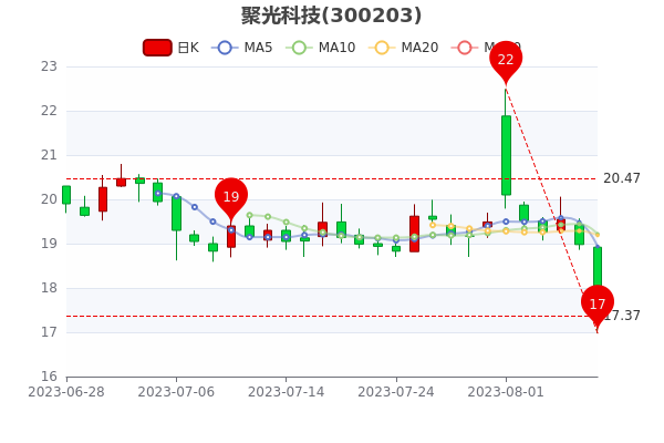 8月14日消息,聚光科技截至12时51分,该股跌2.2%,报16.870元;5日内股价下跌10.03%,市值为76.34亿元。