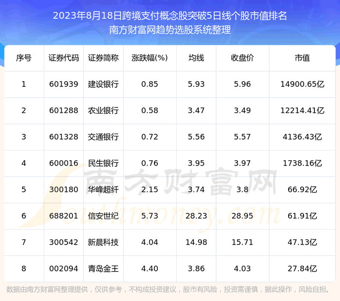 2023年8月18日跨境支付概念股突破5日线个股市值排名