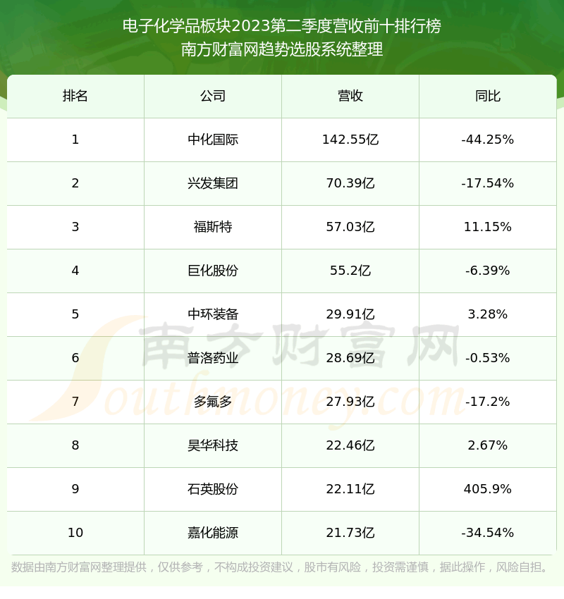 按照趋势选股系统统计,该股所属板块为电子化学品板块,该板块共有43只股票,三孚新科2023第二季度营收在该板块中排名为第43名,该板块2023第二季度营收排名前十的股票如下表: