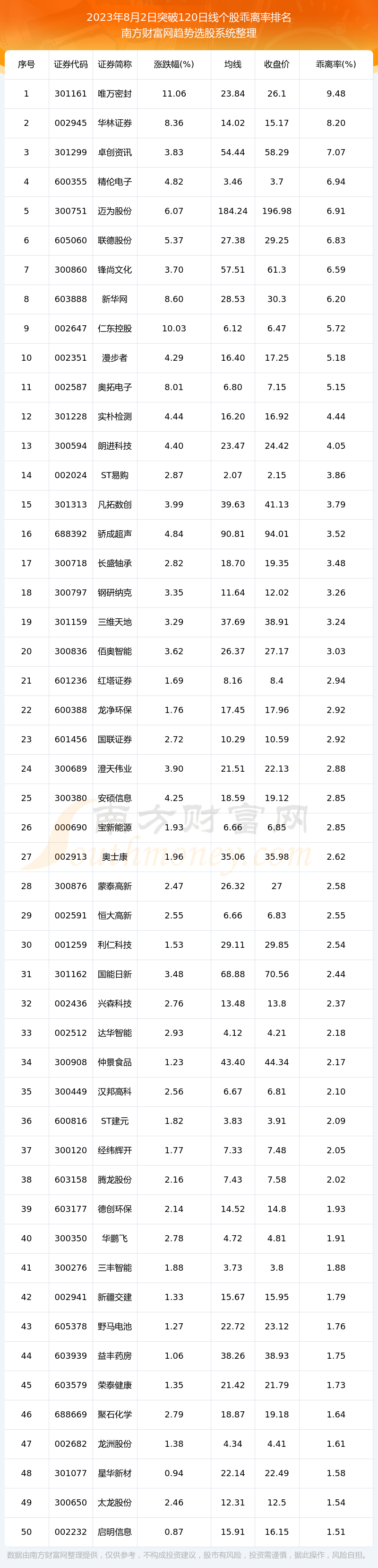 2023年8月17日机器人上市公司突破半年线个股乖离率排名