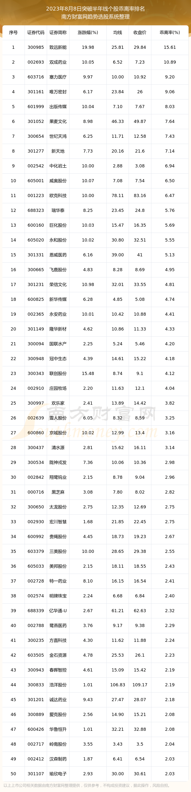 2023年8月28日虚拟数字人上市公司突破半年线个股乖离率排名