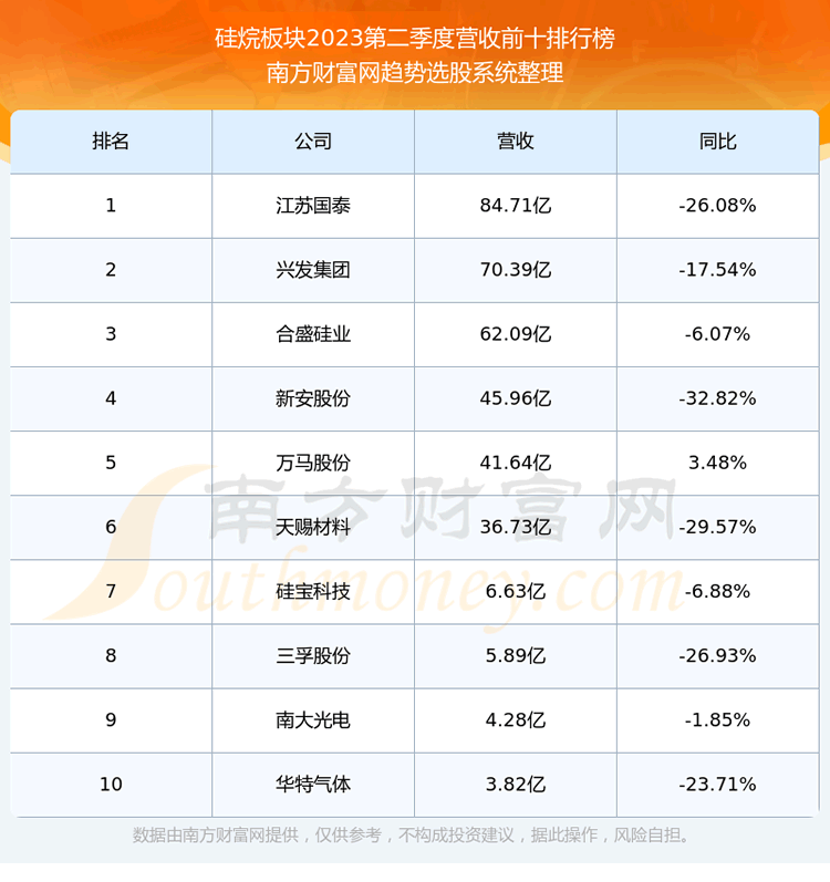 按照趋势选股系统统计,该股所属板块为硅烷板块,该板块共有13只股票,新亚强2023第二季度营收在该板块中排名为第13名,该板块2023第二季度营收排名前十的股票如下表: