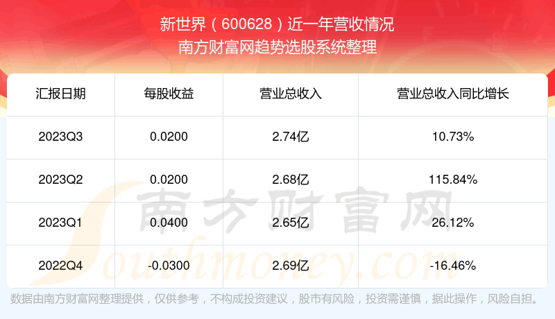 2023年第二季度季报显示,新世界公司营业总收入2.68亿,同比增长115.84%;毛利润为1.07亿,净利润为844.73万元。