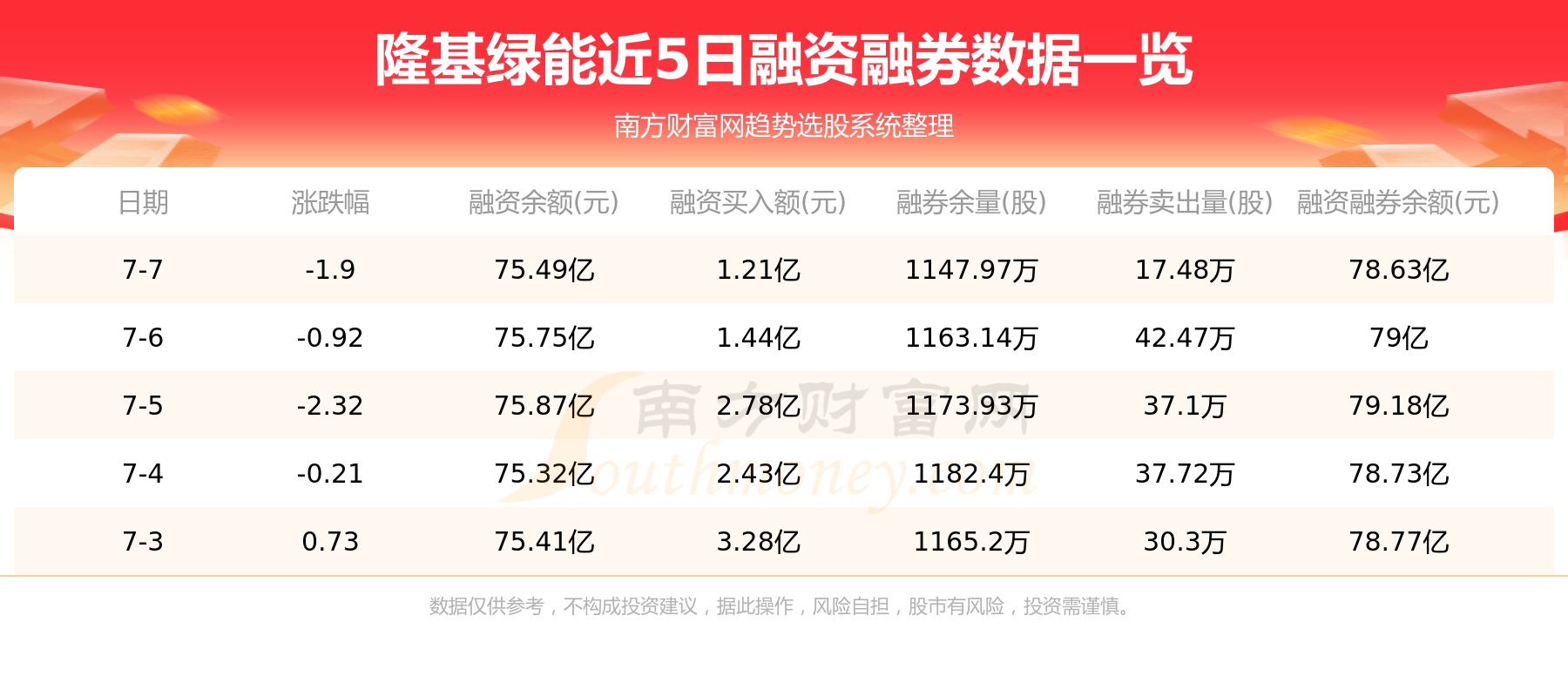 隆基绿能7月7日融券信息显示,融资方面,当日融资买入1.21亿元,融资偿还1.47亿元,融资净买额-2651.59万元。融券方面,融券卖出17.48万股,融券偿还32.65万股,融券余量1147.97万股,融券余额3.14亿元。融资融券余额78.63亿元。近5日融资融券数据一览见下表: