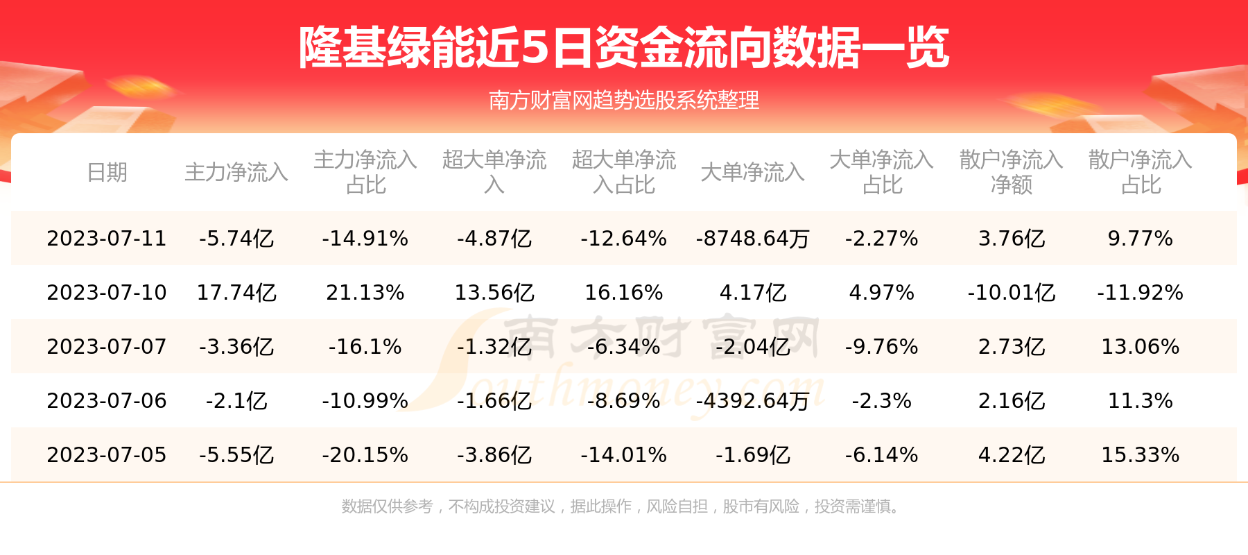 7月19日消息,隆基绿能主力资金净流出1.69亿元,超大单资金净流出1.23亿元,散户资金净流入1.59亿元。