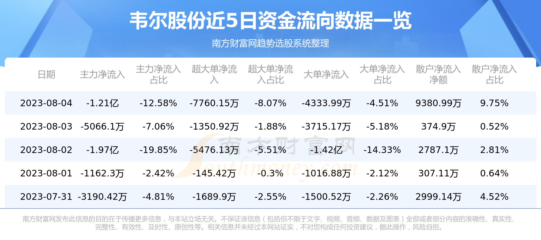 8月4日消息,韦尔股份资金净流出1.21亿元,超大单净流出7760.15万元,换手率0.77%,成交金额9.62亿元。